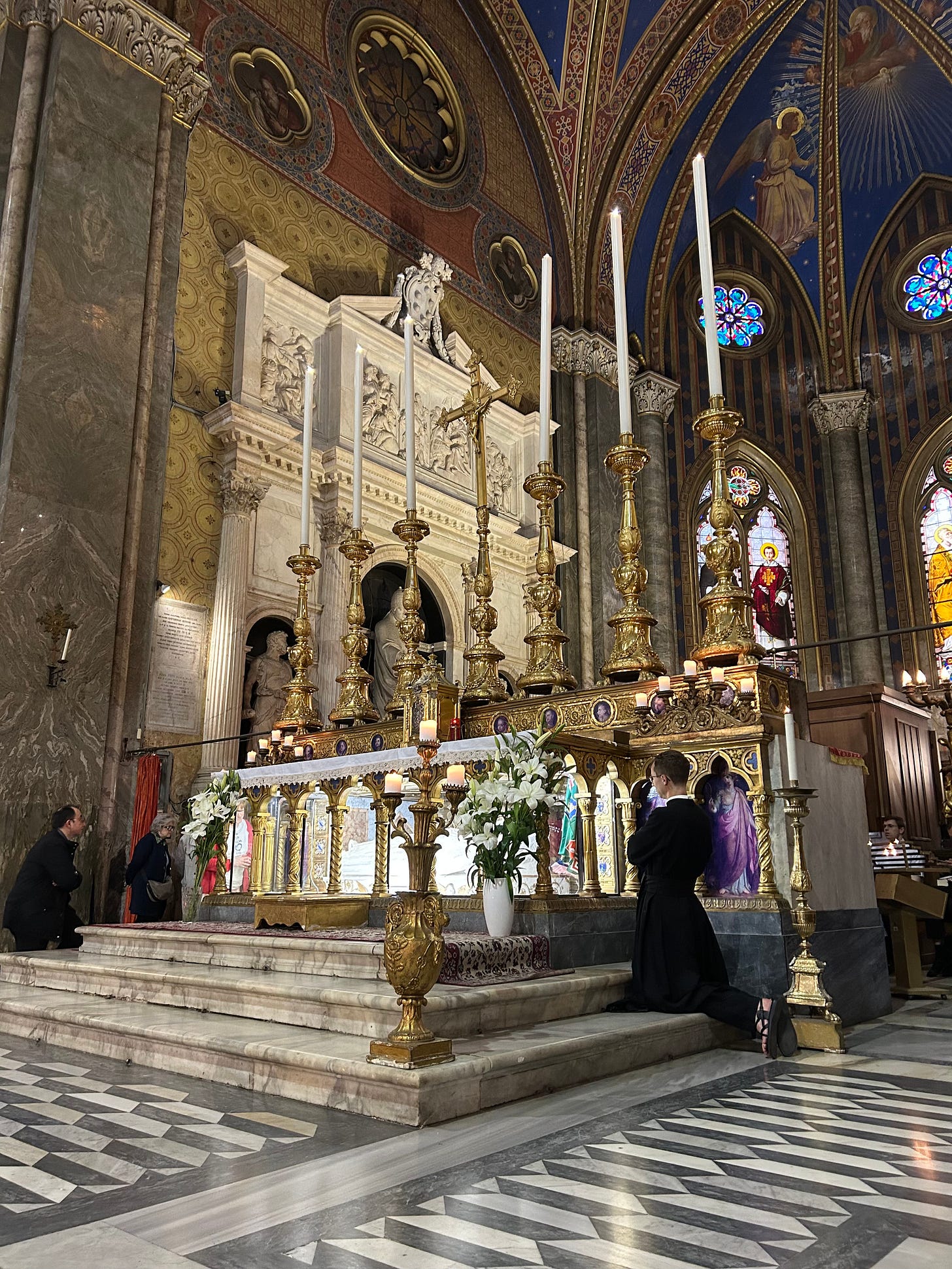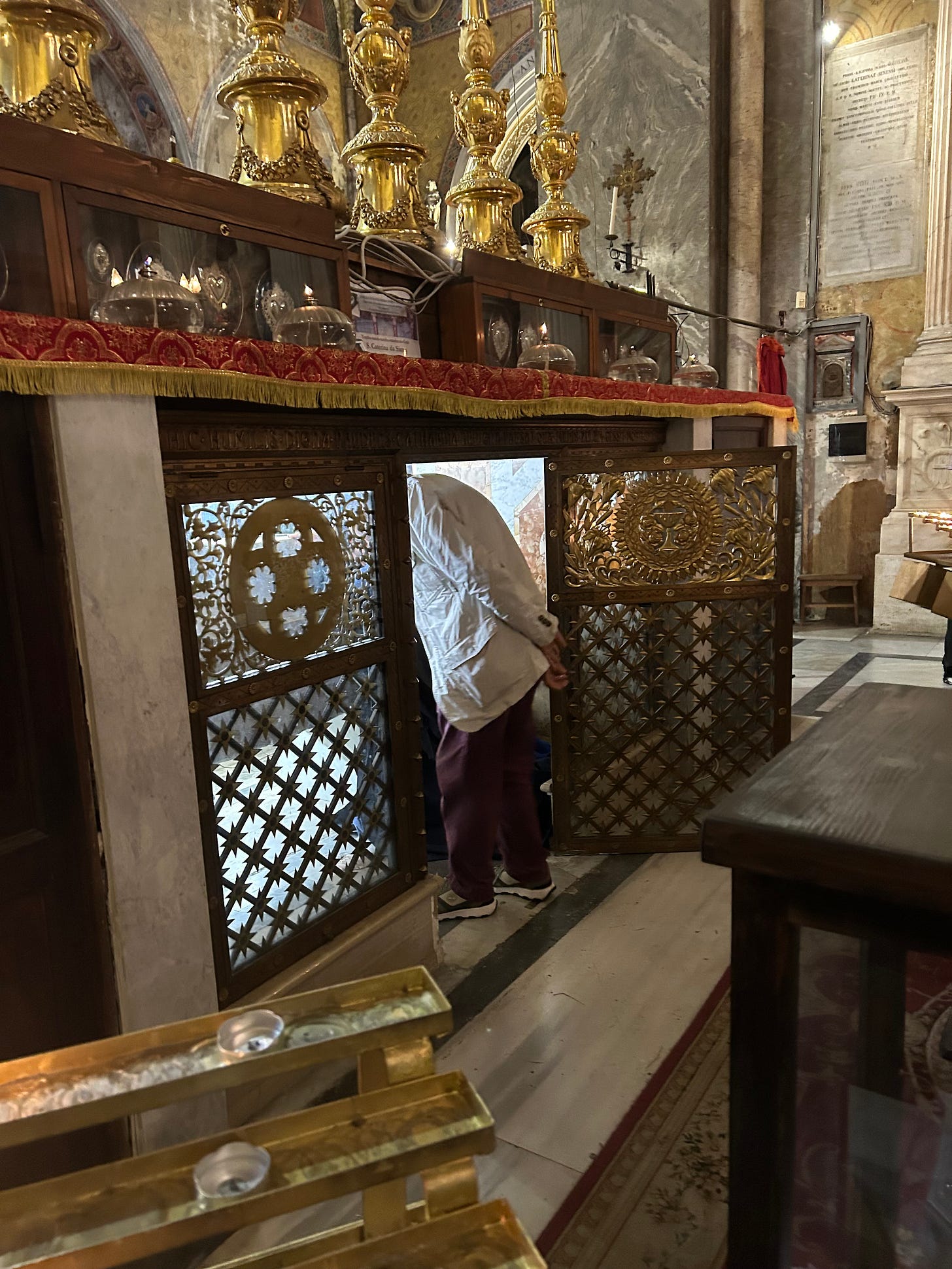 My photo of St. Catherine of Siena’s tomb in Santa Maria Sopra Minerva, April 29th, 2025. For her feast day, they opened the glass casing in the back and allowed people to step inside and pray at the marble sarcophagus